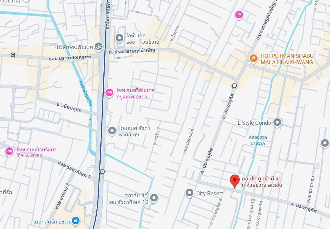 รวมคอนโด ซื้อ ขาย ให้เช่า U Delight @ Huaykwang station (ยู ดีไลท์ แอท ห้วยขวาง สเตชั่น) ที่อยู่ ถ. ประชาอุทิศ แขวงห้วยขวาง เขตห้วยขวาง กรุงเทพมหานคร คอนโดใกล้รถไฟฟ้าสีน้ำเงิน MRT ห้วยขวาง ใกล้ มหาวิทยาลัยหอการค้าไทย มหาวิทยาลัยศรีนครินทรวิโรฒ ประสานมิตร เซ็นทรัลพระราม 9